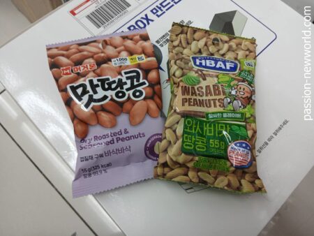 ビールのおつまみとして買ったピーナッツ。左は皮付きロースト。右はワサビ味。いずれも1000ウォン。