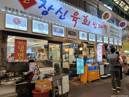 ソウルの人気観光スポット・広蔵市場は食の宝庫でもある。この日はユッケ通りから少し離れた交差路にある「新昌信(チャンシン)ユッケビンデトック」を訪問。ネットでの評価が高いこのお店。ユッケだけではなく、ビンデトック(緑豆チジミ)も提供している。広蔵市場名物のユッケとビンデトックを両方食べられる店として有名なのだ。