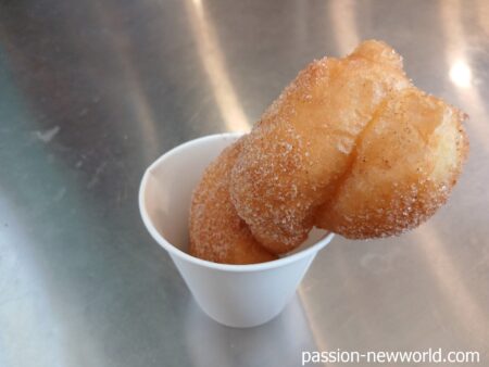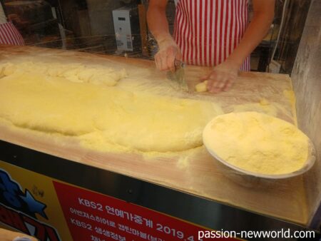 お会計を済ませて外を散策。広蔵市場にはスイーツのお店も多い。そこで超有名なガベギ(ねじりドーナツ)のお店へ。すでに長い行列ができていたが、5分ほどで買えた。