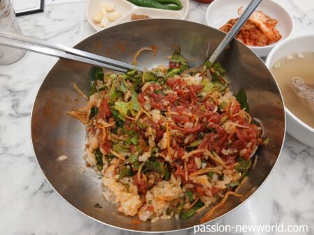広蔵市場の絶品ユッケビビンバ 1万ウォンでコスパ良し 「新昌信ユッケ」は緑豆チヂミも自慢のメニュー