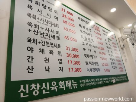 お値段はというと、ユッケの料理がズラリと並んでいる。お目当てのユッケビビンバを注文。1万ウォン(1050円ほど)と思ったよりリーズナブル。