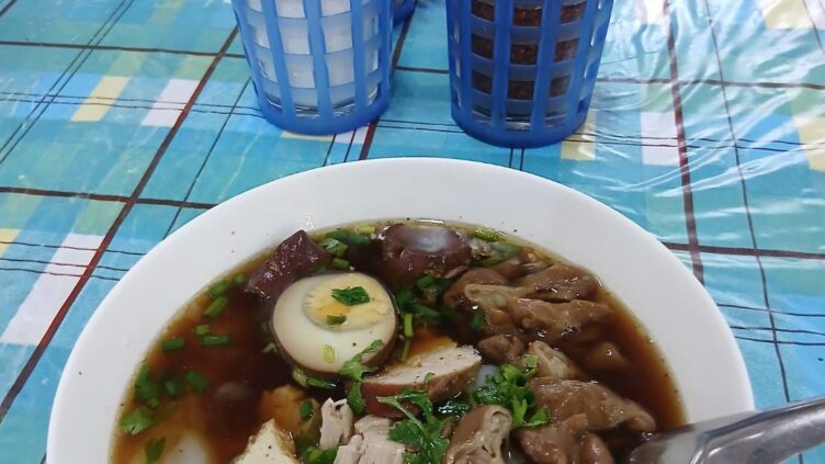 【タイ編】 NEW!KLメトロ至近距離にヌードル店がオープン パンチの効いたクイッティヤオはたっぷり野菜付でお得 50バーツ KLメトロ北側に聳えるサワディーサイアムホテルは、紫と白のまだら模様の壁面で威容を誇っている。その足元にこじんまりした食堂ができていた。茶色く澄んだスープにビーフン。牛肉もそこそこたくさん入っている。日頃、不足しがちな葉っぱを大量投入してスプーンで口へ運ぶ。 2025.10.04 【タイ編】Food