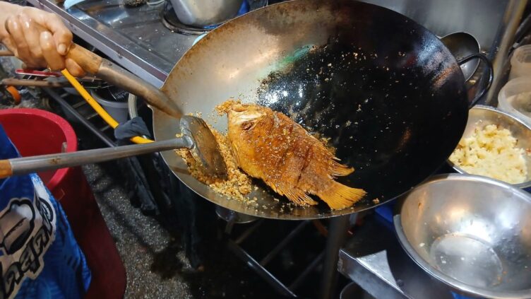 【タイ編】 ホアヒンのシーフード 魚の丸揚げが絶品 パンチがきいた大量ガーリック 1300円 後ろの中国人ファミリーが魚の丸揚げ料理を注文。運ばれてくる料理を見て驚愕した。実に旨そうだ。値段を聞くと「300バーツ」。食べたい! いったいどんな魚なのか? 「これだよ」。レッドスナパーだ。油の海に投入。いったん取り出して今度は大量のガーリックとともに炒める。 2025.09.06 【タイ編】Food