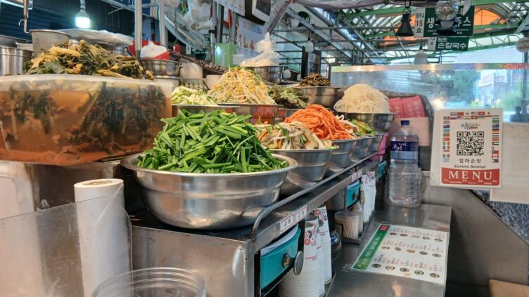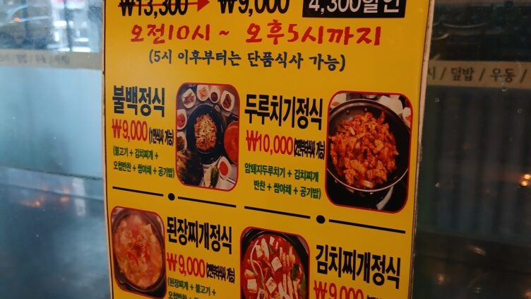 1万3300ウォンのメニューが9000ウォンというランチ特別価格。左上のブルベク定食を注文してみた。でに炒めてあるたっぷりの豚肉を目前で一気に熱くする。肉に適度の脂身があり、甘味を感じる。熱々を口に運んでフーフー言いながら食べるのが楽しい。キムチチゲも付いているので交互に食べると旨さ倍増だ。